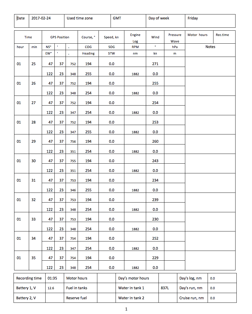 Here’s an example of the logbook output. One could use this with an hour granularity for quite a nice logbook template. It generates an .odt file which you can then open in Word or your editor of choice. I’m not sure where the 837L of water is on Grace – that must be an error!